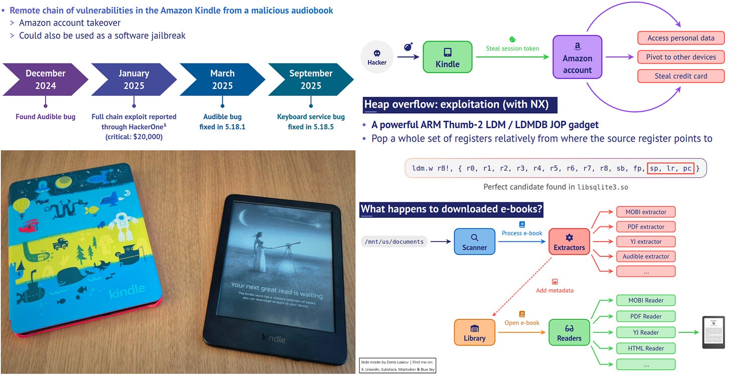 Security researcher Valentino Ricotta shares his super insightful research on the internals of Amazon Kindle: how it works, how books and audiobooks are processed, and what vulnerabilities it has.
