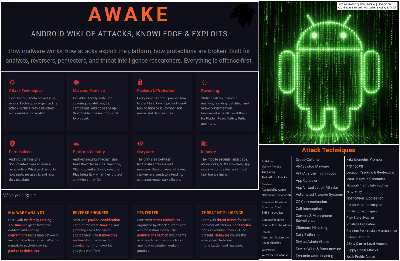 AWAKE: Android Wiki of Attacks, Knowledge & Exploits [GitHub] https://zahidaz.github.io/awake/
