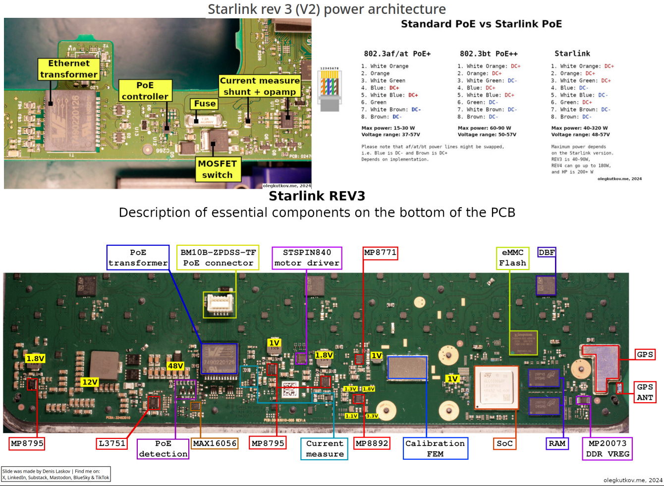 Security researcher and hardware expert Oleg Kutkov shares his knowledge of Starlink’s power architecture. Apparently, Starlink uses a fully custom, non-standard Power-over-Ethernet system because standard PoE simply cannot deliver the massive power these terminals need.